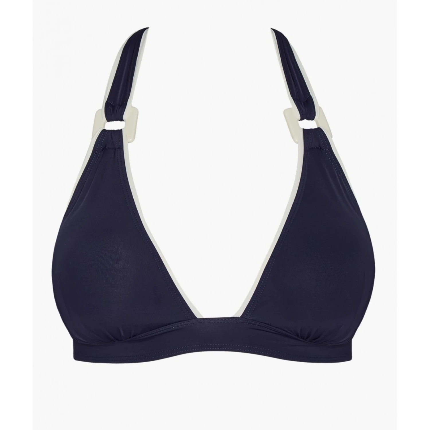 Cet été on craque pour ce haut de maillot de bain en forme TRrangle sans armatures à la fine coque en mousse amovible. De jolis boutons bicolores et des boucles laquées de forme carrée signent les modèles de cette incontournable ligne balnéaire, raffinée et confortable.