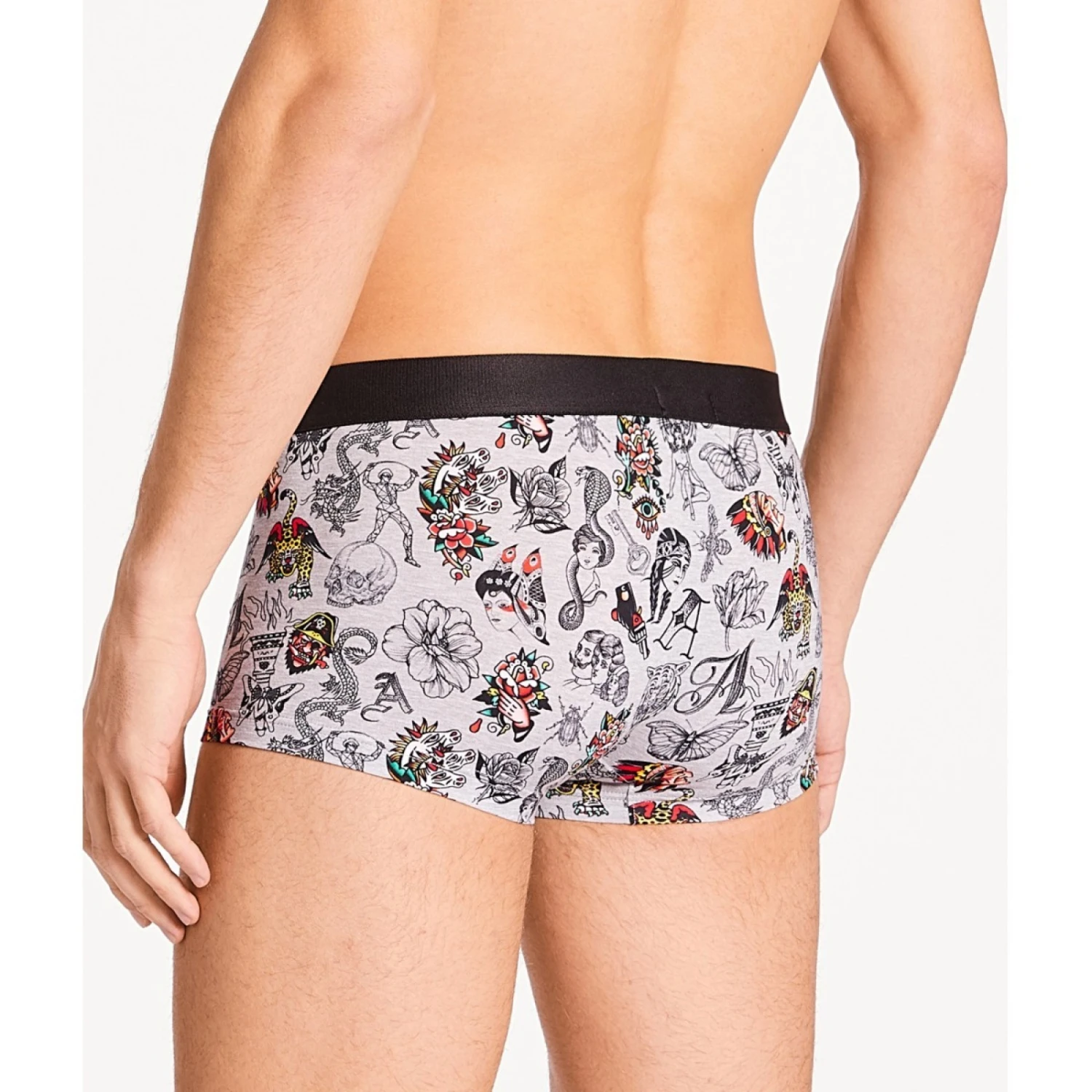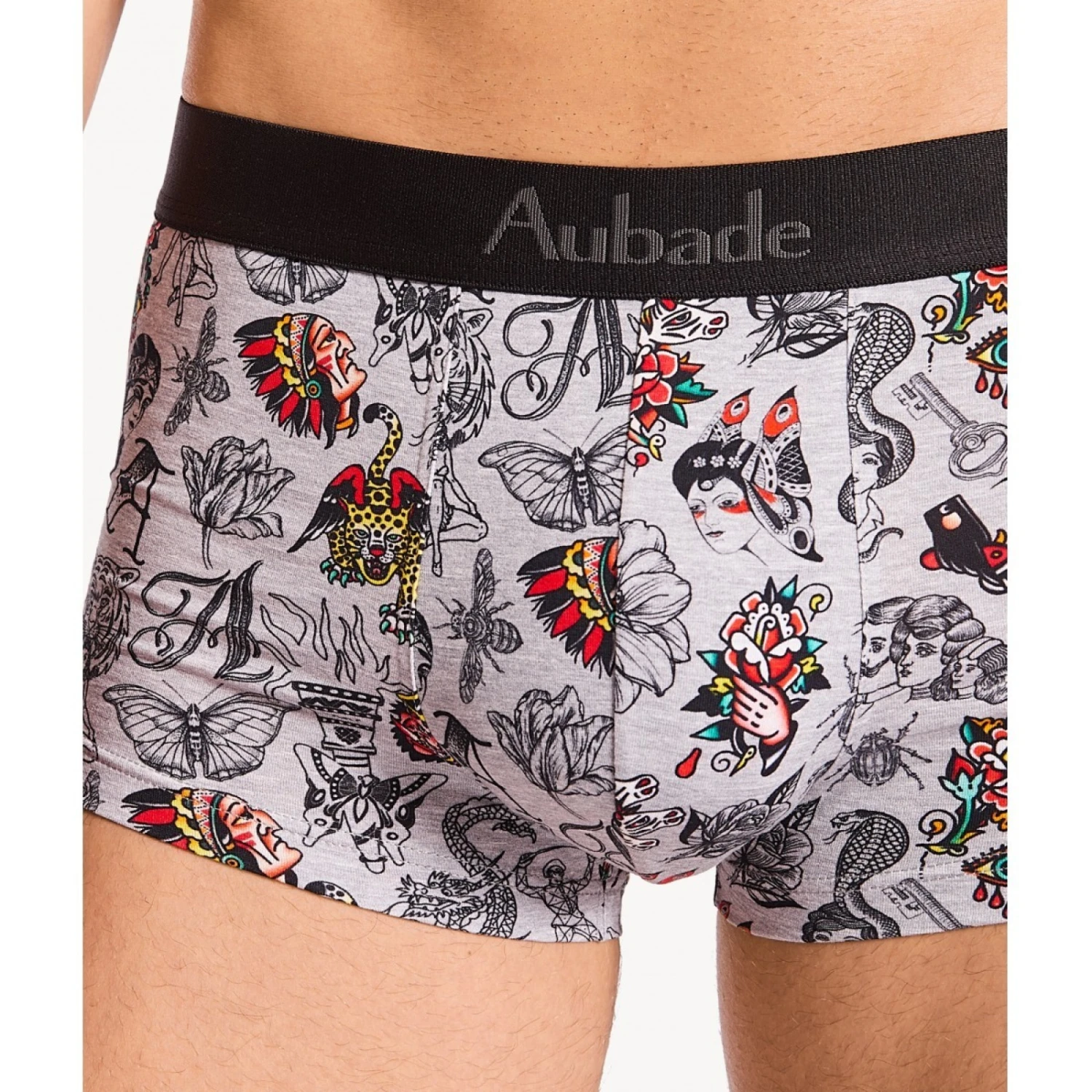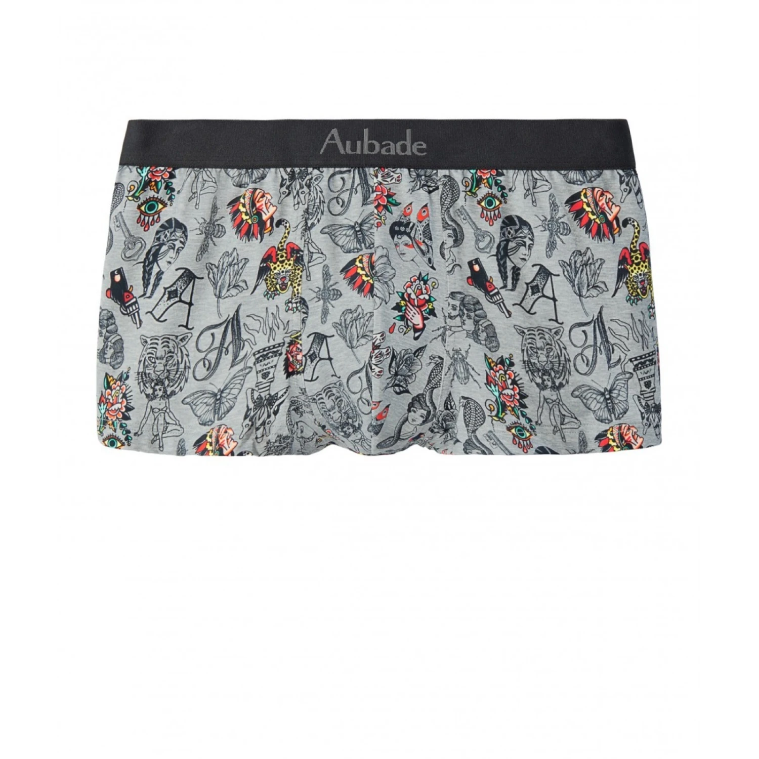 L’imprimé pêle-mêle de tatouages sur fond gris chiné, véritable oeuvre d’art à porter. Ceiture noire logotypée Aubade en gris contratsé.