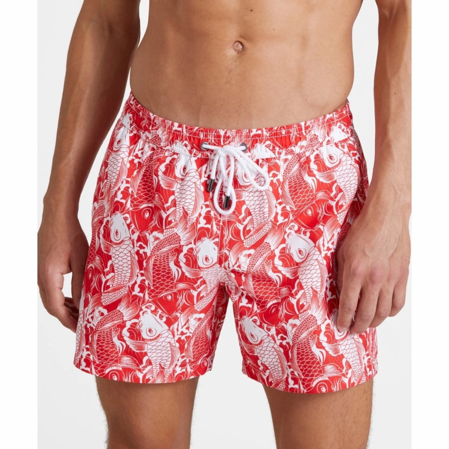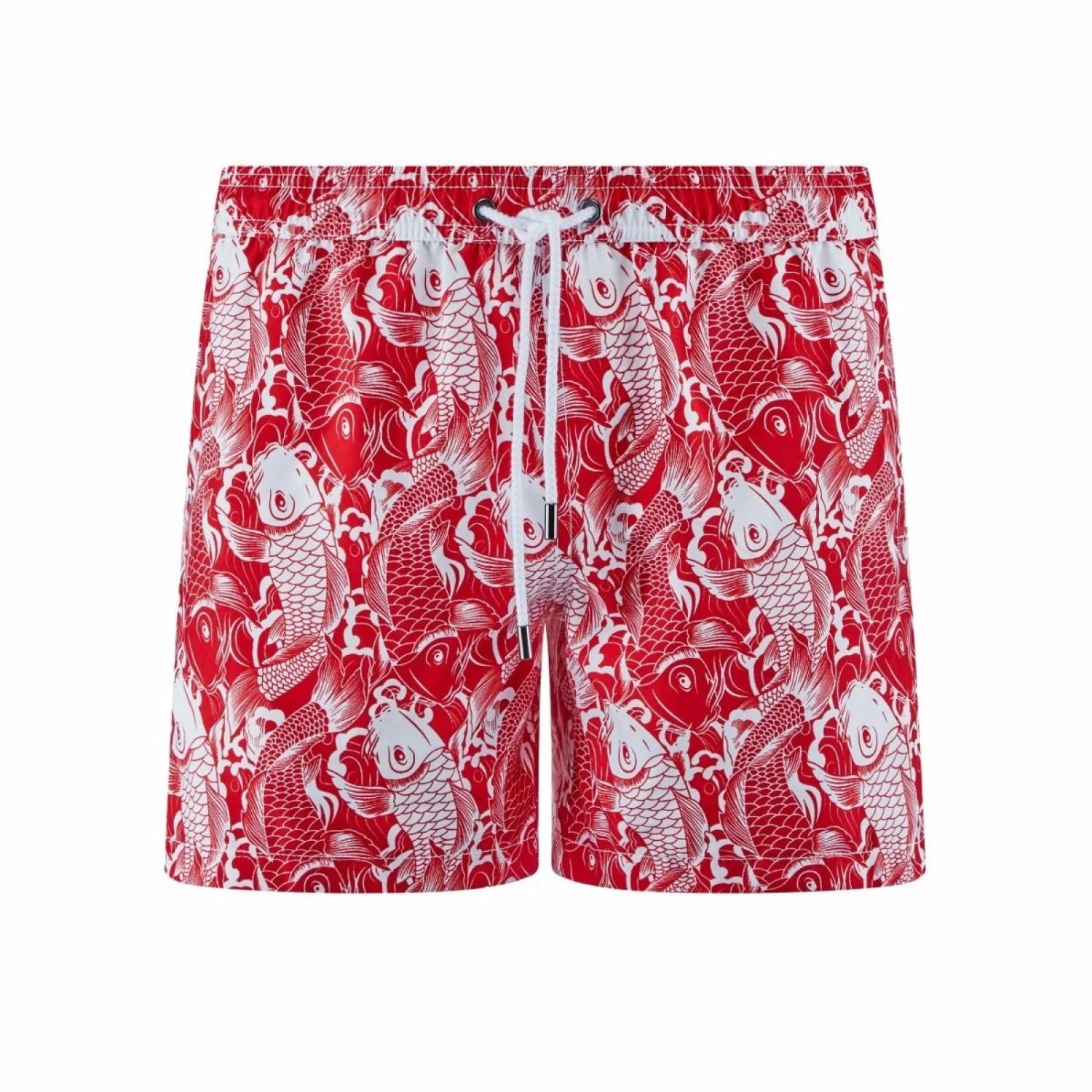 Le Maillot de Bain X Camille Lacourt présente un motif à carpes et se décline en coloris Rouge et Bleu.