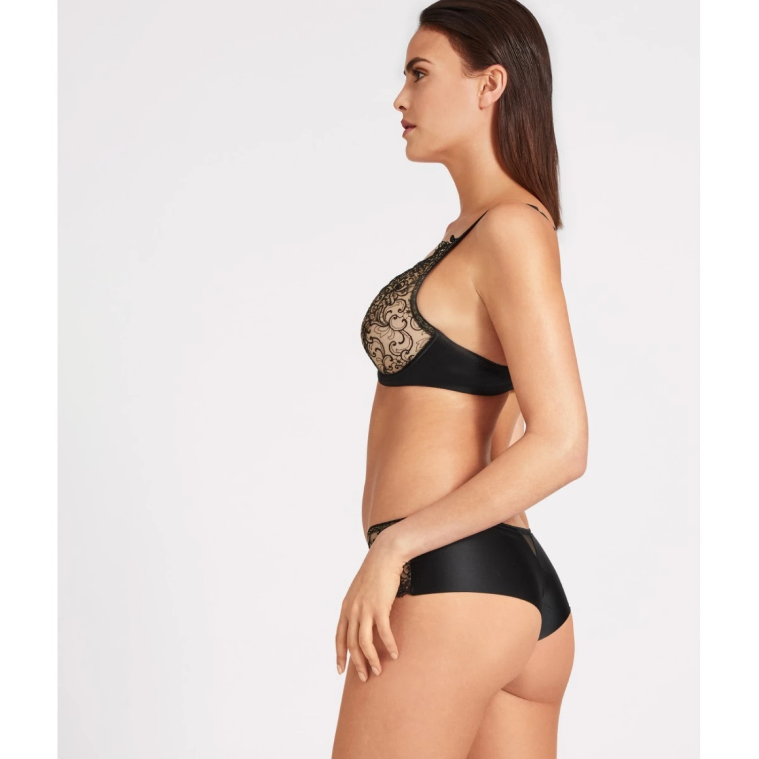 On aime ce shorty Saint Tropez pour sa broderie à effet guipure transparente. Se marie très bien avec le soutien gorge triangle sans armature de la collection Miss Karl réf UC10-TUXE.