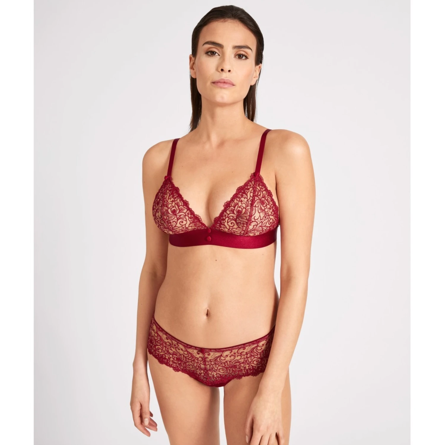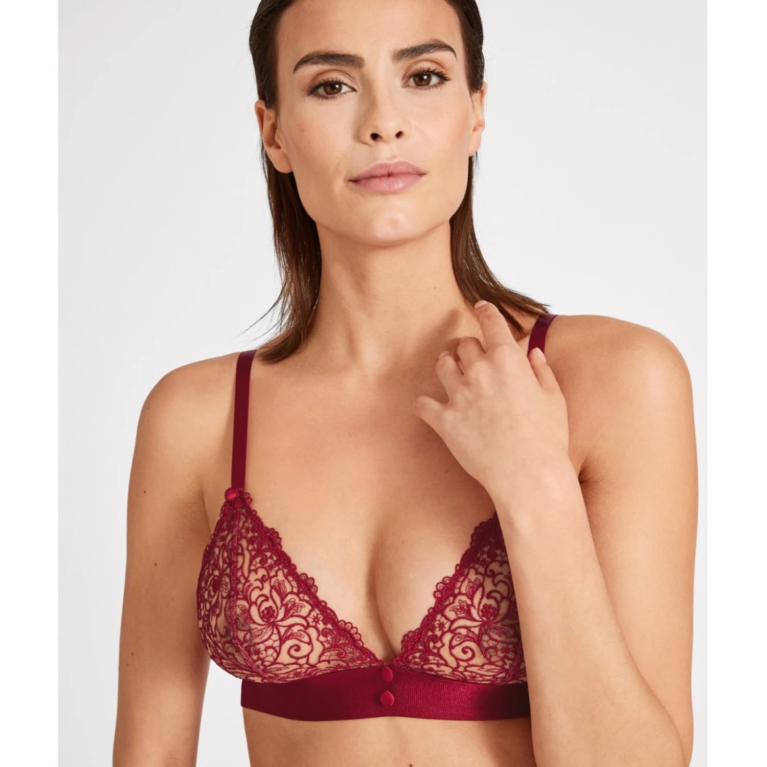 On aime ce soutien gorge triangle sans armature pour son effet broderie guipure transparente.