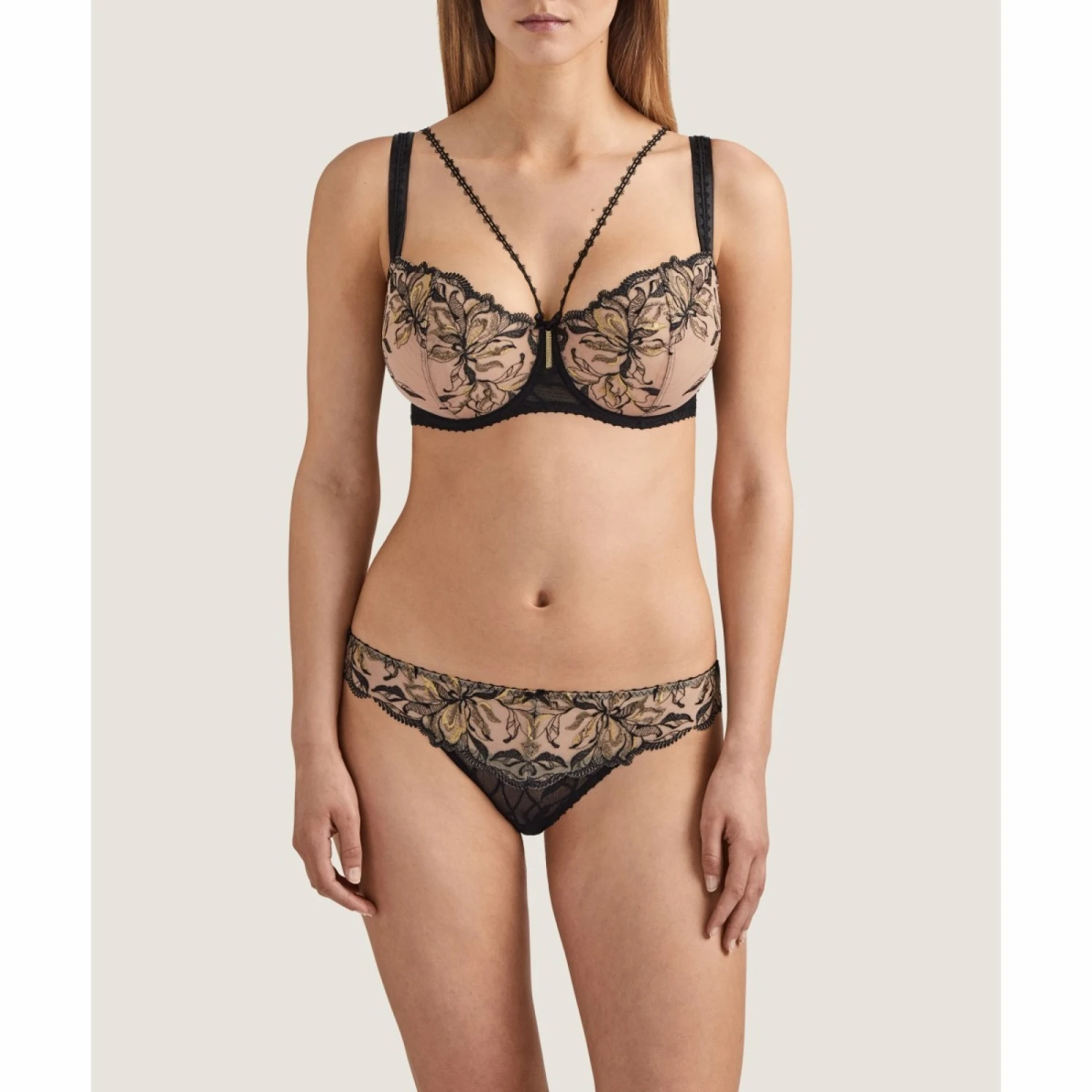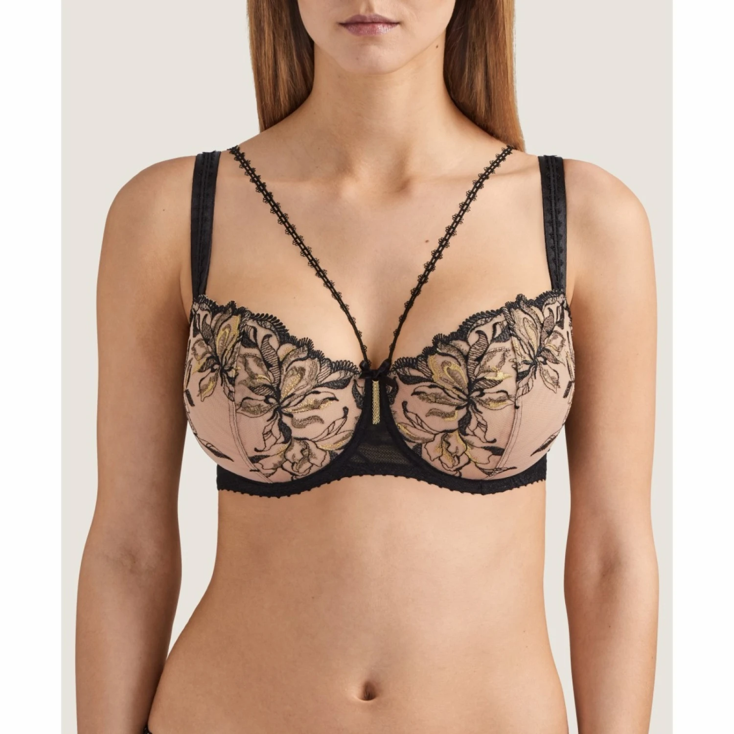 Ce soutien-gorge Corbeille Confort convient aux poitrines génereuses qui ont besoin d’un maintien optimal .Le décolleté pigeonnant s’ouvre sur un motif flamboyant de broderie raffinée, et scintille dans les petits détails, du petit nœud sexy au joli pendentif en laiton.