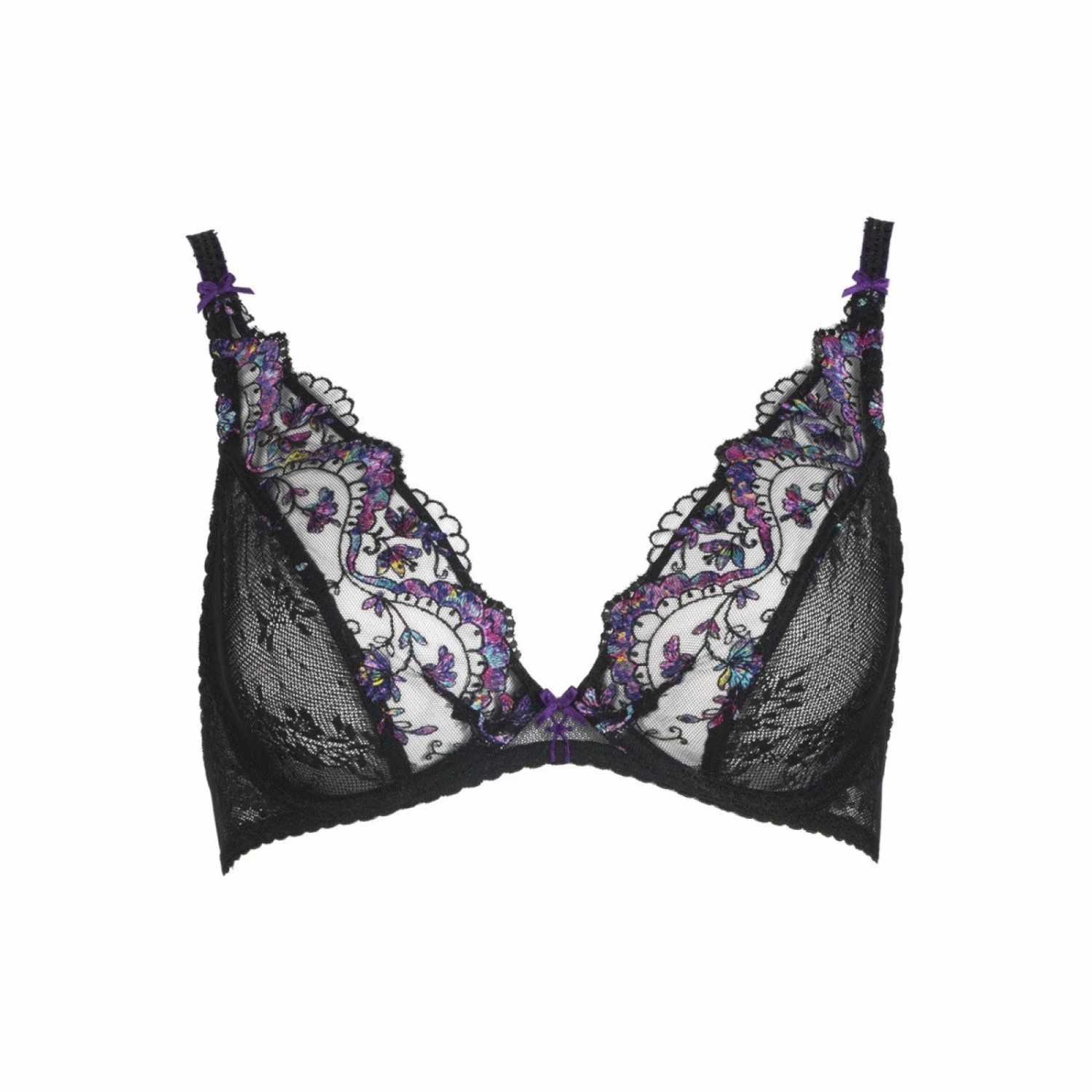 Un soutien-gorge Triangle mais avec des armatures en dentelle et à l’esprit végétal : une broderie à l’imprimé Floral sur fond noir avec des petites touches prune vives.
