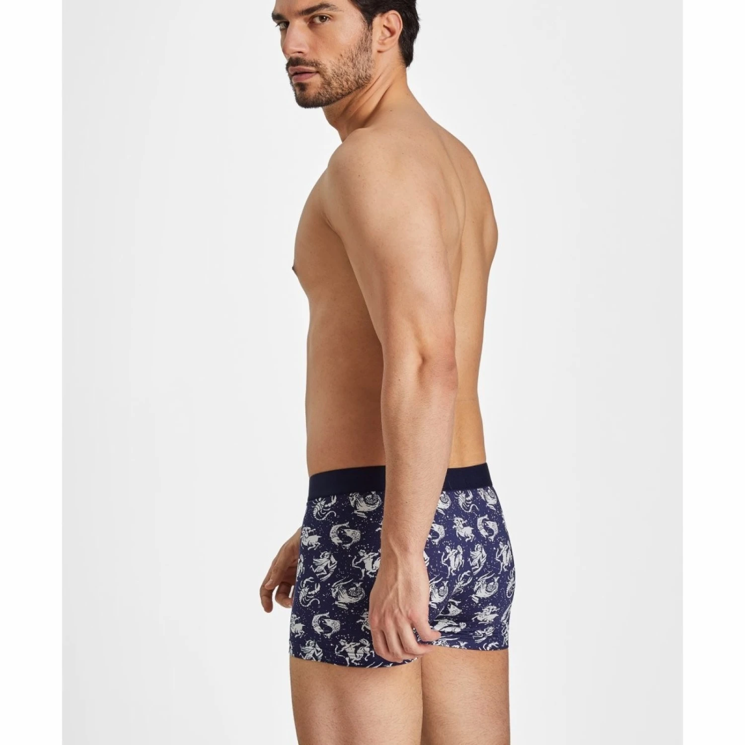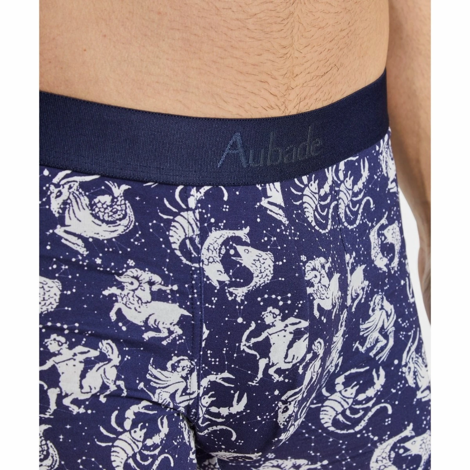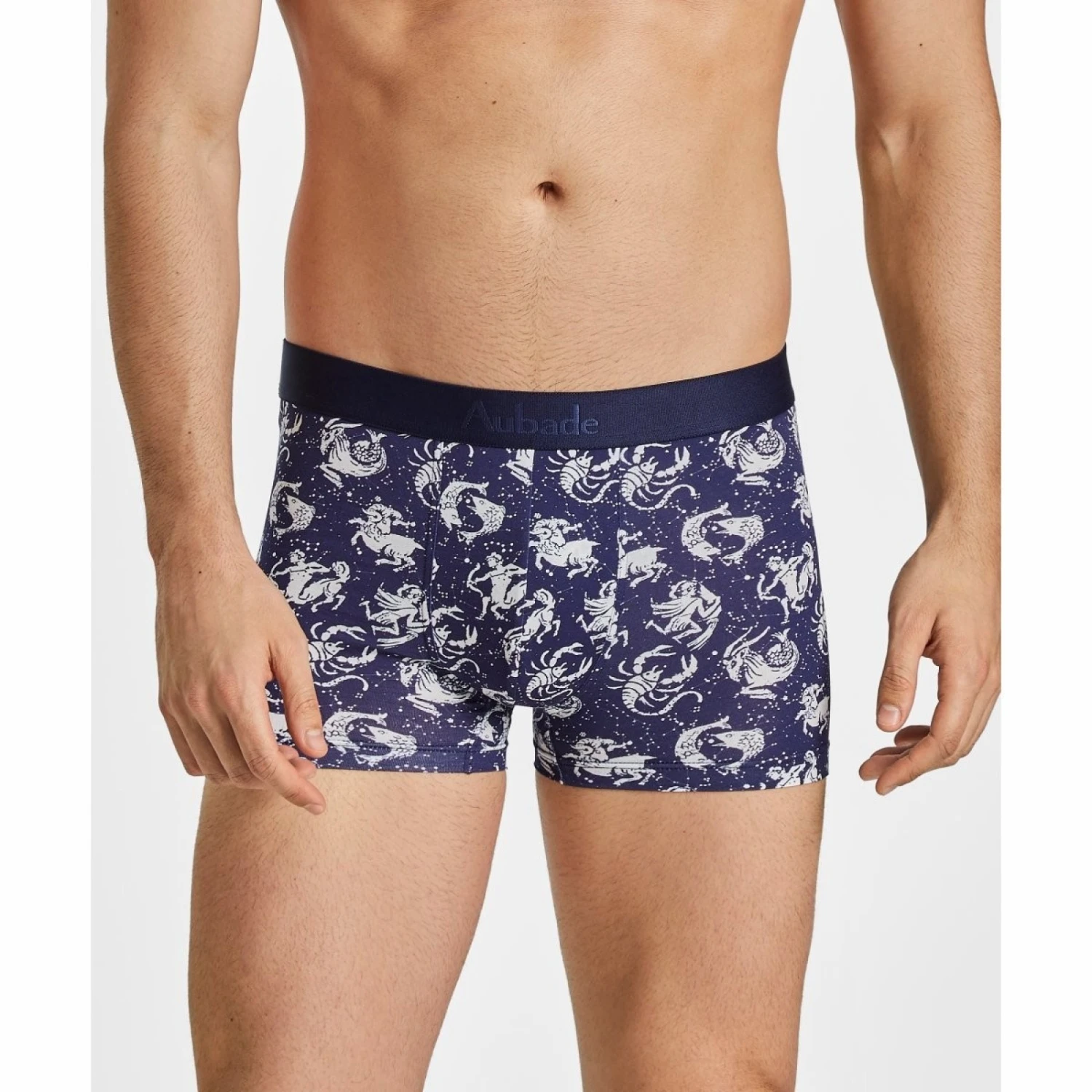 Réinterprétation des signes du zodiaque en blanc sur fond marine couplé avec un uni blanc. Ceintures bleu marine logotypées Aubade ton sur ton