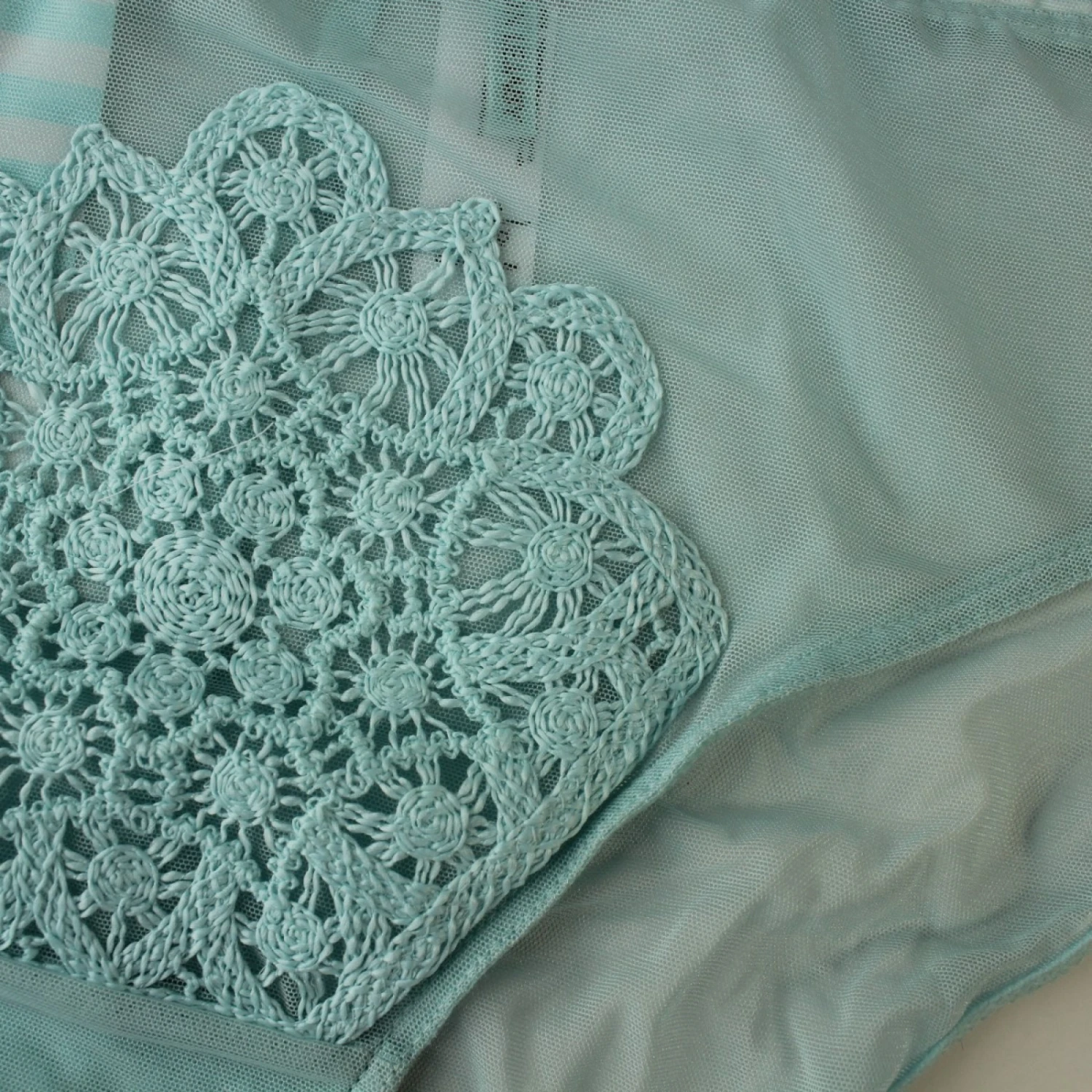 Le slip Ankara de la Maison Lejaby propose une coupe de culotte basse. Il entièrement fabriqué en tulle semi-transparent d’une grande légèreté. On trouve dans le dos une couture verticale qui évite d’écraser le fessier, et sur le devant une pièece de guipure luxueuse qui donne tout son charme à ce slip. Coloris Bleu pastel (intitulé Vert sur le picto coloris de la dernière image)