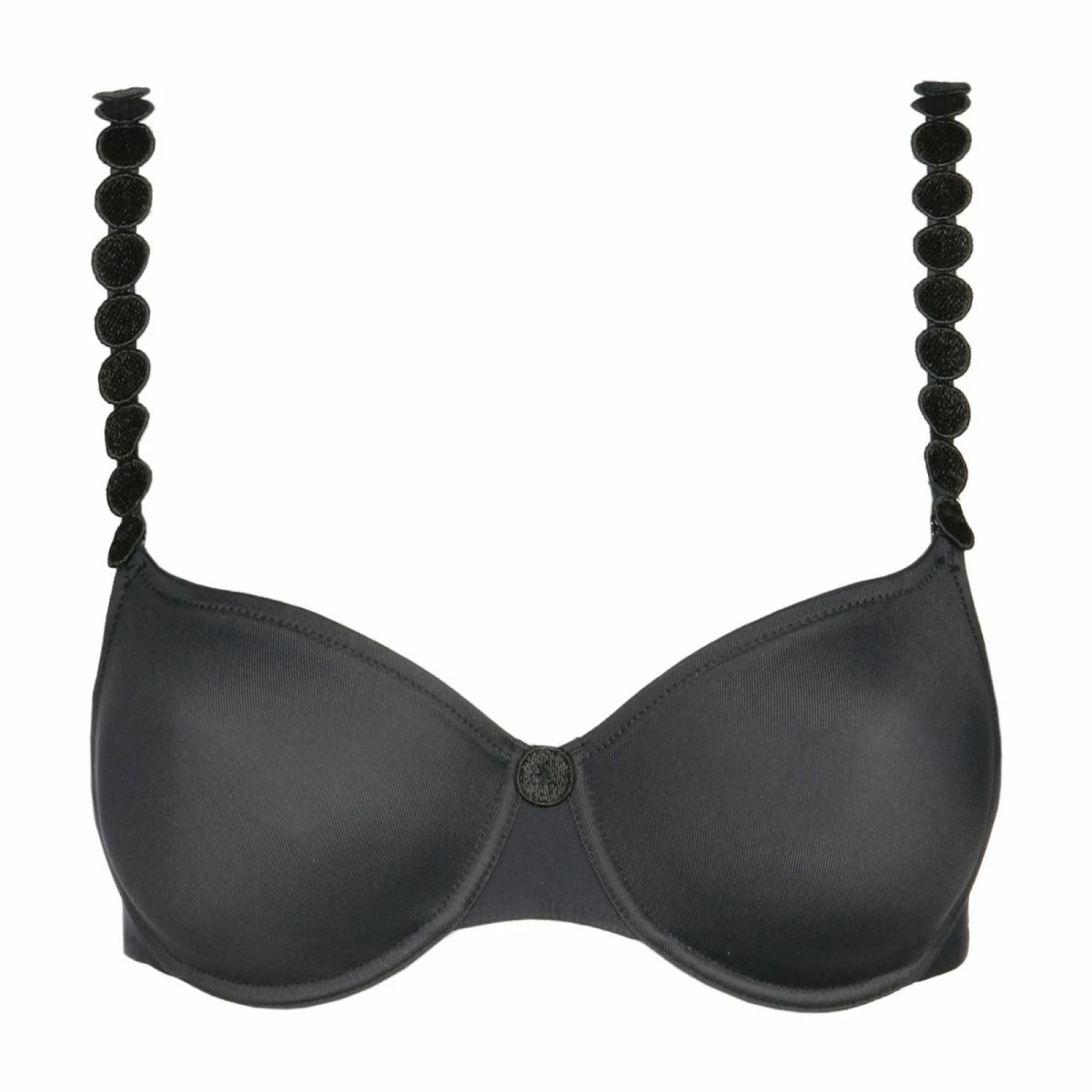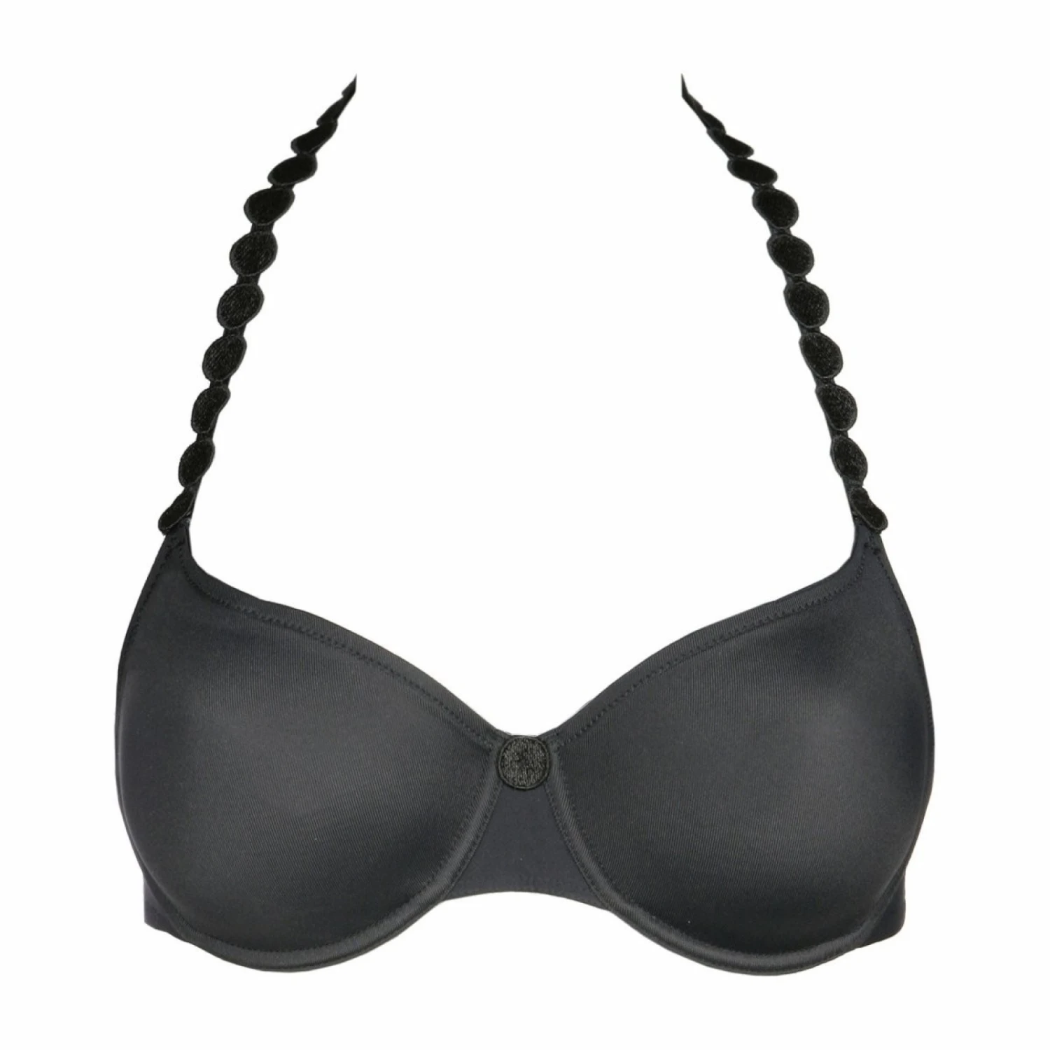 Le coloris Charbon est un gris foncé, moins dur que le noir où l’éclat satiné de la bretelle en petites perles rehausse le ton.