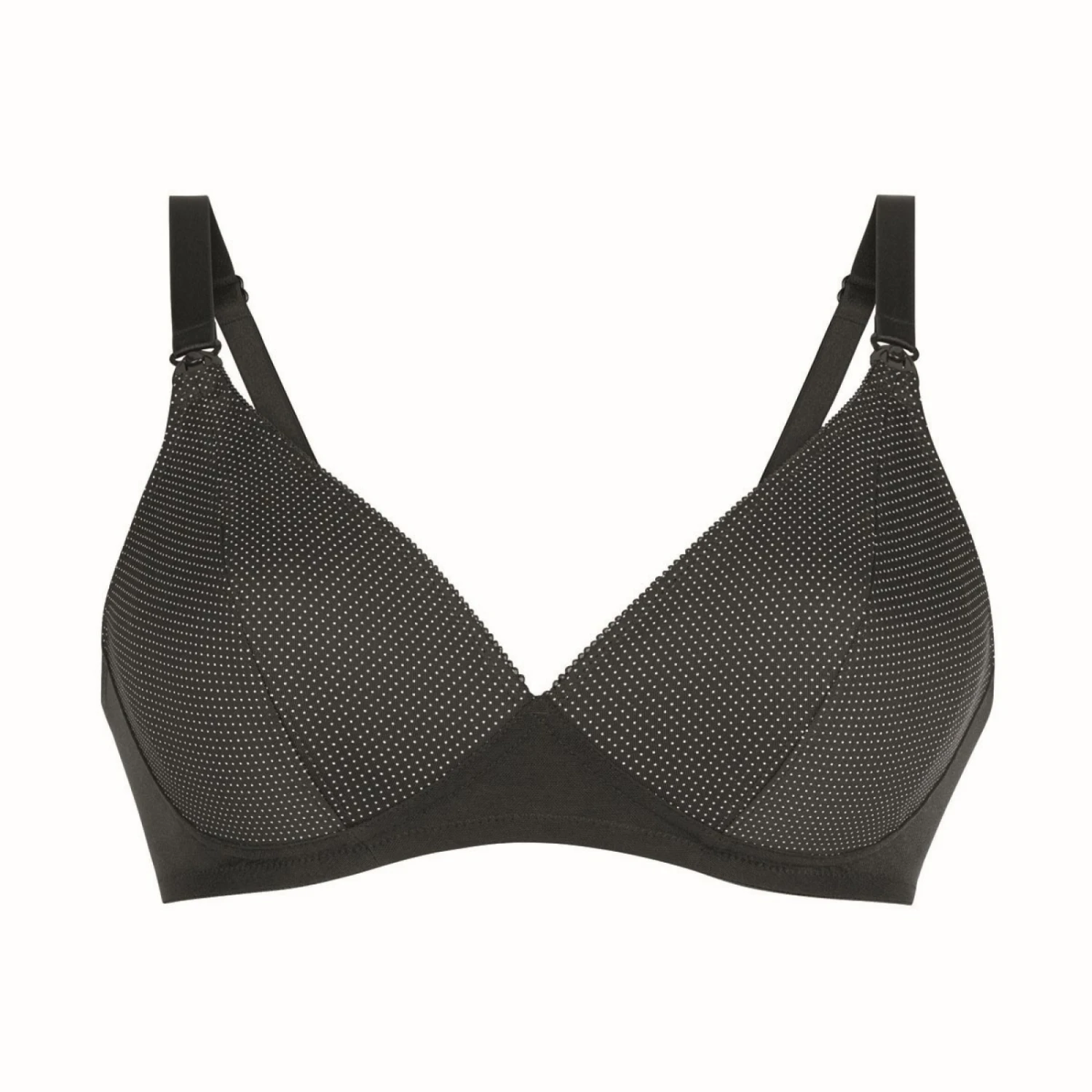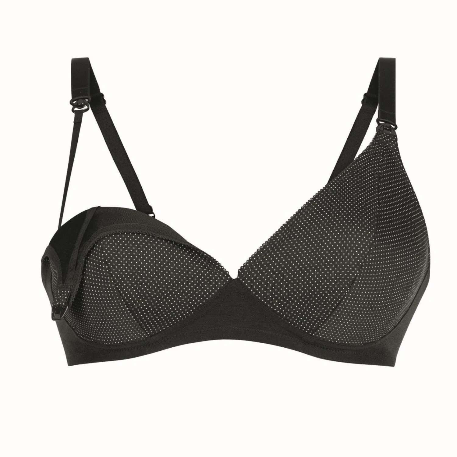 Un joli soutien gorge d’allaitement noir à petits pois en forme triangulaire pour une large ouverture et un allaitement facile et confortable.